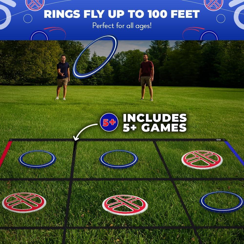 🙌GIANT SIZE – Bring on the epic backyard battles with this tic tac toe game! It's 5x bigger than the competitors (9ft x 9ft) and 100x the fun. Toss those flying rings and battle it out to be the king of the rings!