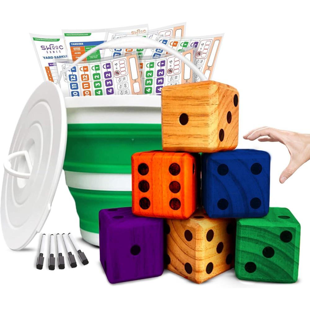 SWOOC Games - Yardzee Outdoor Game with Bucket - All Weather - 5 Scorecards & Markers - Quick & Farkle Yard Dice Set